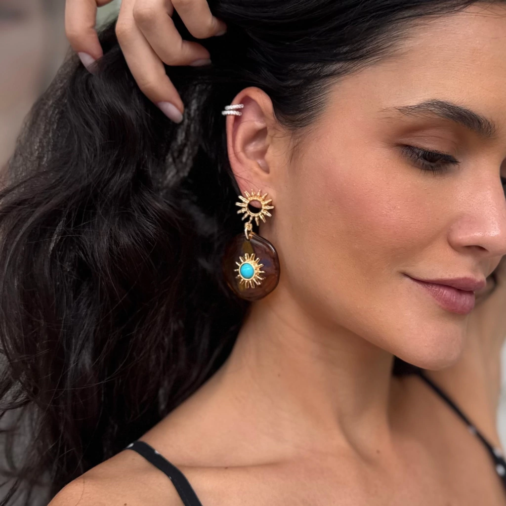 Descubra a elegância e o charme do Brinco Folheado 18k Dourado Sol Resina Caramelo/Azul Mayanne, uma peça que une sofisticação e estilo em cada detalhe. Com 6,5 cm de comprimento e leveza impressionante de 16g o par, este brinco é perfeito para quem deseja um visual marcante e moderno.
