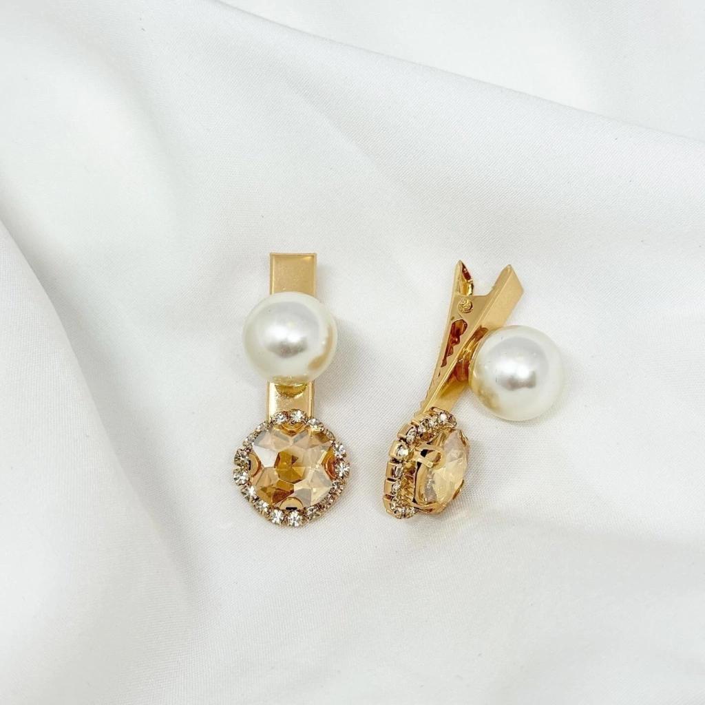 Adicione um toque de elegância ao seu visual com esta sofisticada pregadeira de metal dourado com verniz, em estilo bico de jacaré. Este acessório deslumbrante é adornado com um chatom colorido, detalhes em strass brilhante e uma grande pérola que exala luxo e charme. Ideal para prender o cabelo de forma segura e estilosa, esta pregadeira combina praticidade com um design refinado, perfeito para qualquer ocasião especial ou para elevar o seu look diário.